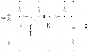これは、下図のような単安定マルチバイブレーターにLEDバッファを付けた回路が一般的です。