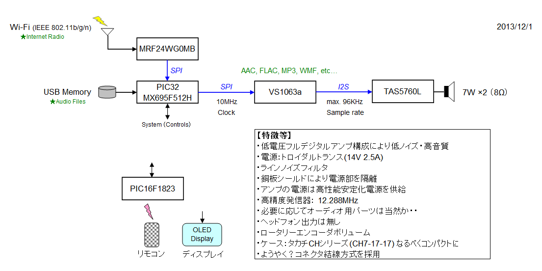 ちなみに、MRF24WG0M ではなく、MRF24WB0M を使いたい場合は、HoneySystem.h にある #define MRF24WG をコメントアウトするだけで切り替えることが出来ます。ピンコンパチなので、回路はそのままでOKです。今作では、その使用目的から、インターネットラジオとファイル再生が出来て、デジタル入力無し、ヘッドフォン無しとします。アンプというよりは、プレイヤー、レシーバーですね。