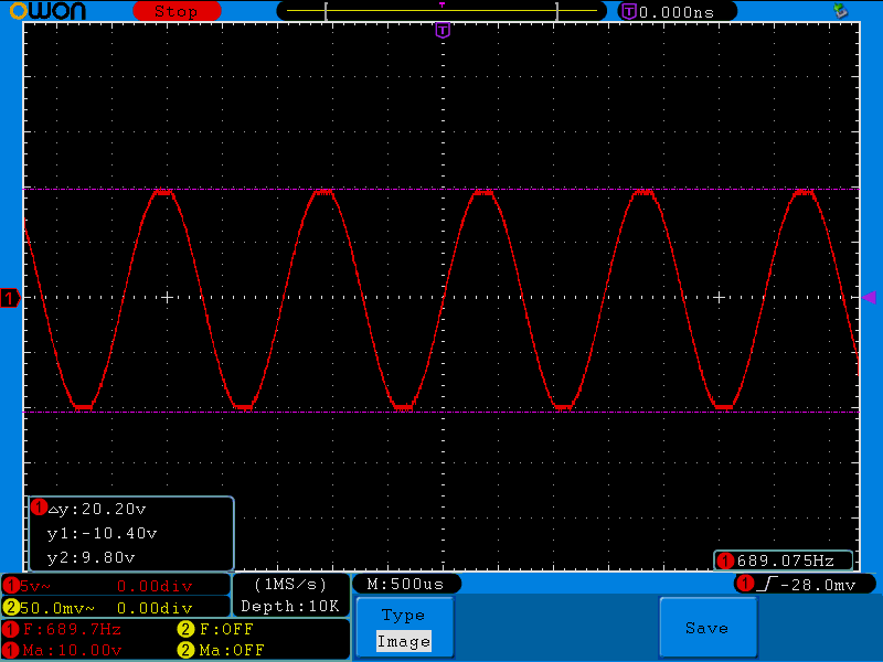 約 ±10Vp-p の振幅が得られていますが、上下が少しクリップしています。
