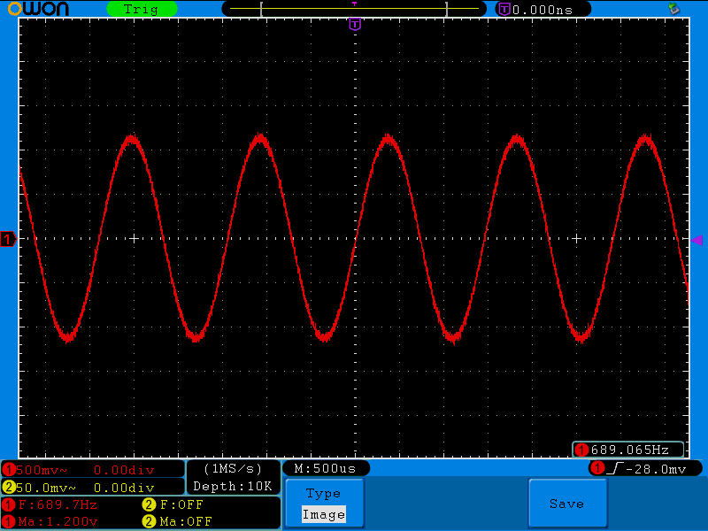 VS1063a の正弦波信号を、ボリューム -0dB(最大音量)で出力した時の波形です。