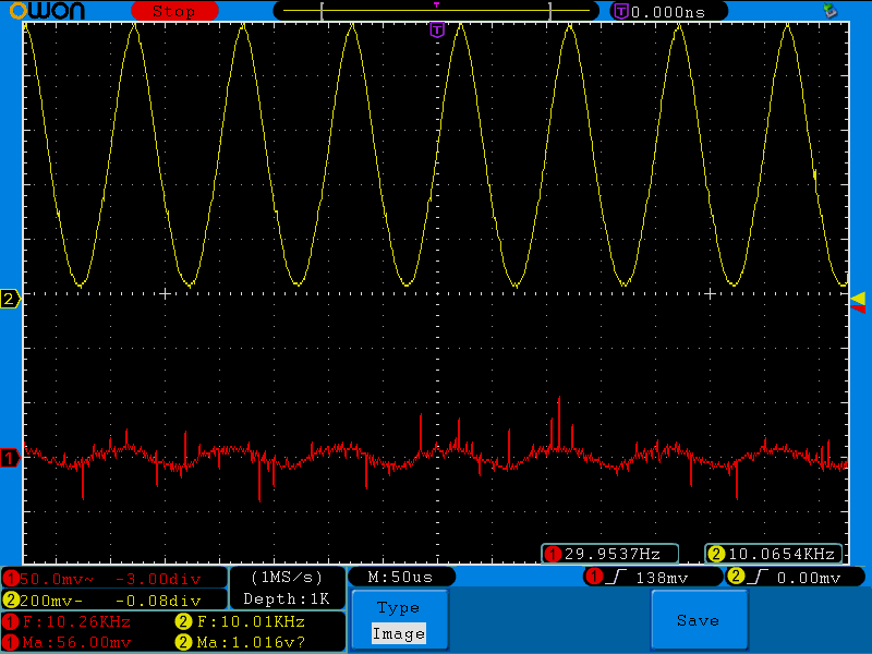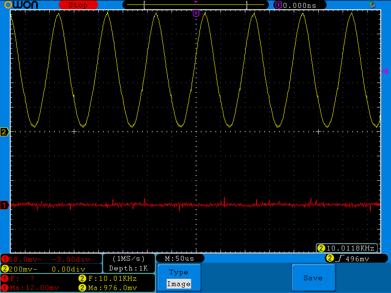 1KHz,10KHz にて、2Vp-p の変調をかけた電圧を入力し、どの位安定した電圧が出力されるかどうかのテストを行います。