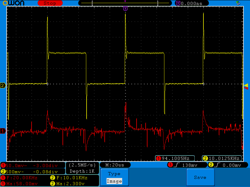 黄色のCHが負荷変動を表しています。0.5Ωの両端で計測したので、上側が 2A、下側が 0A となります。