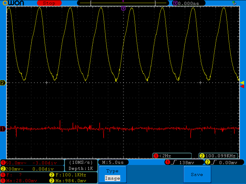 100KHz入力時では、出力に数十mVの波が観測されました。