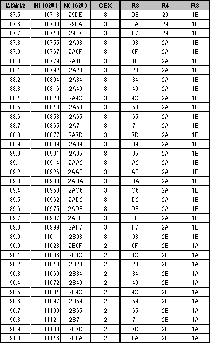 下表は、公称周波数内での日本国内のFMラジオ周波数と、設定値を一覧したものです。