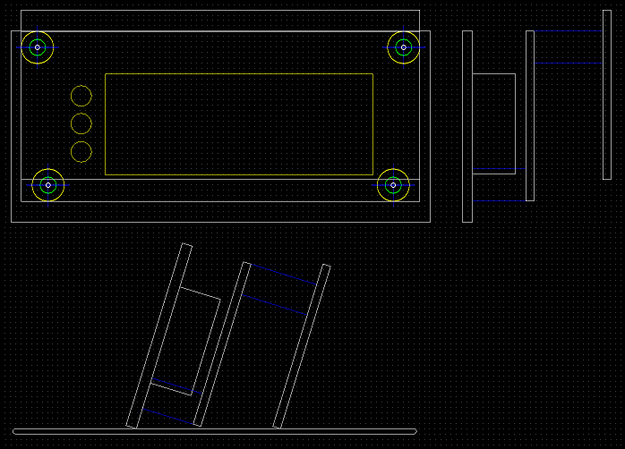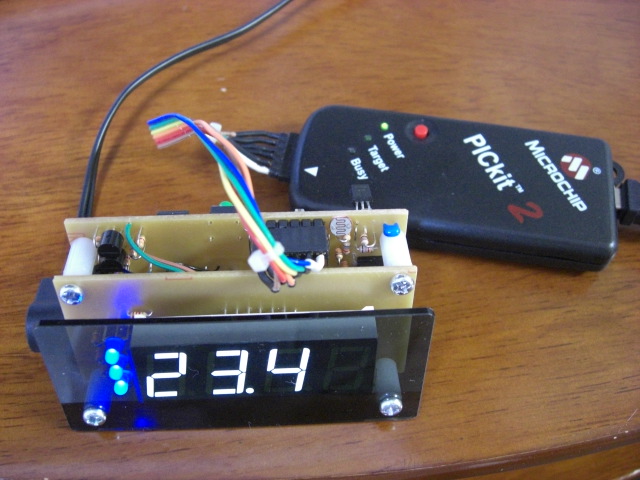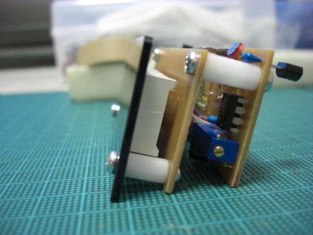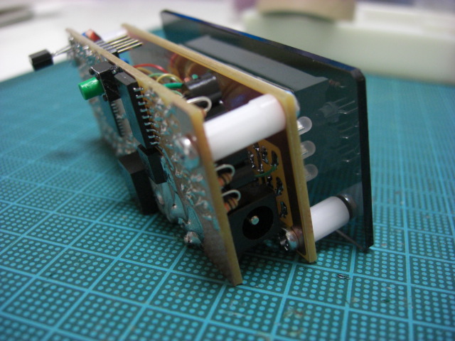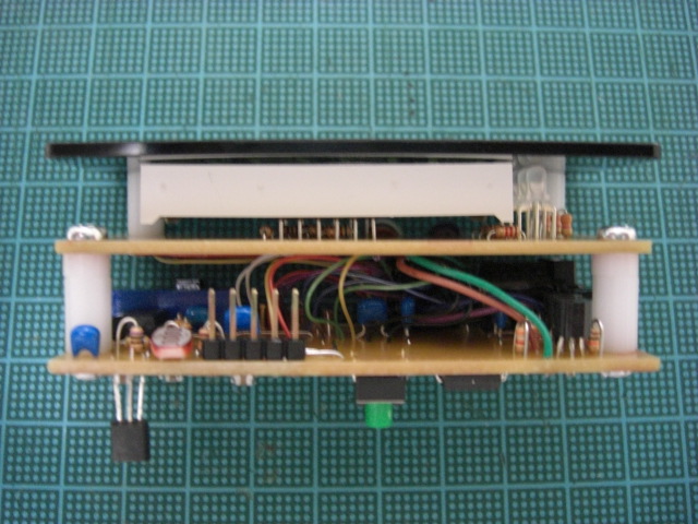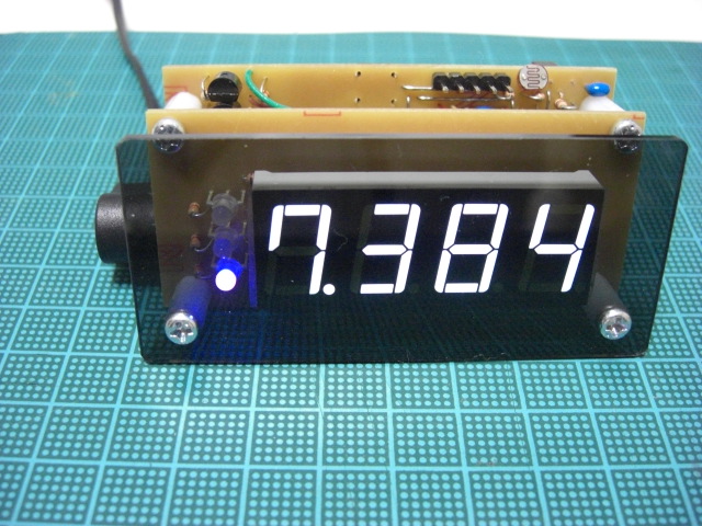 外形図(PCBEをCAD代わりに使っています) まず、ここでようやく7セグLEDの保護シールを剥ぎます。 そして、アクリルパネルとディスプレイ基板の間を、10mmスペーサー2本で留めます。 ディスプレイ基板とメイン基板を、13mm(10mm+3mm)スペーサー2本で留めます。 3mmスペーサーは普通のジュラコンで良いですが、10mmの方は6角(ネジ切付き) タイプです。 電源ON アンプゲインを表示しているところ 組み立て後でもICSP可能です