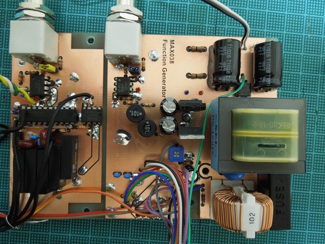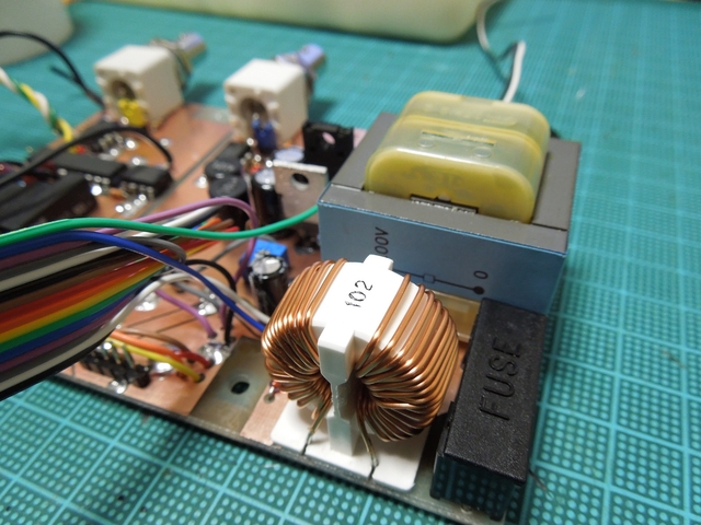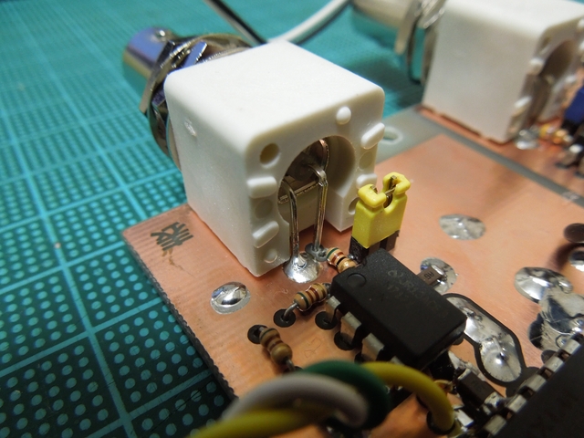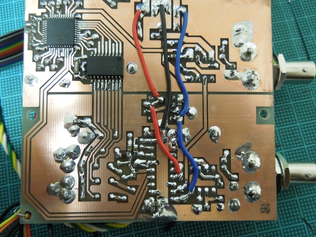 スルーホール代わりの表裏をつなぐジャンパ、チップコンデンサ、ディップIC、BNCコネクタ、