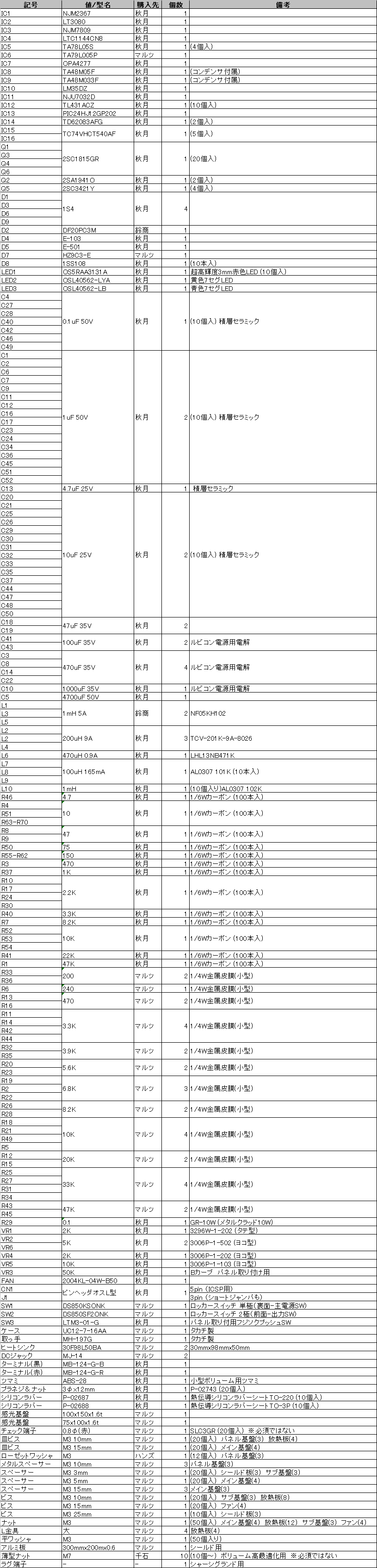 多くの主要パーツは、秋月で手に入ります。