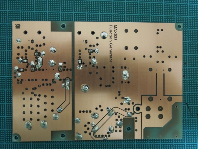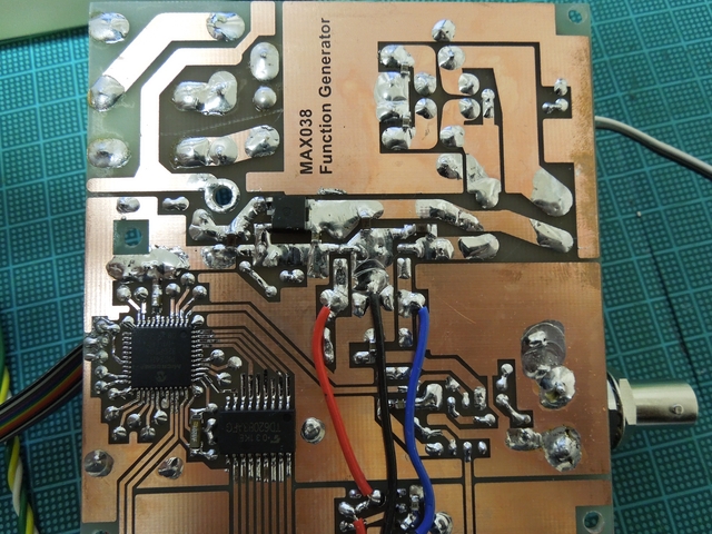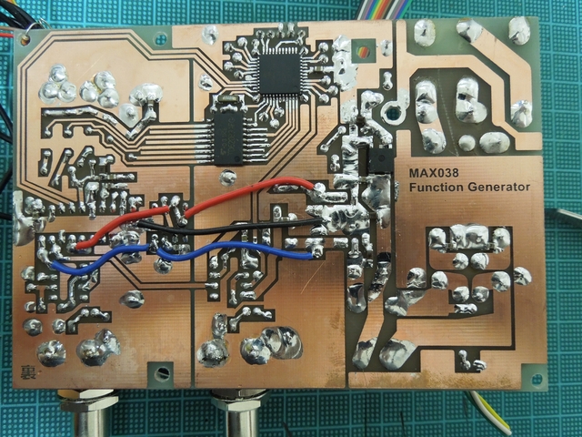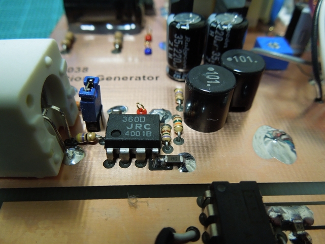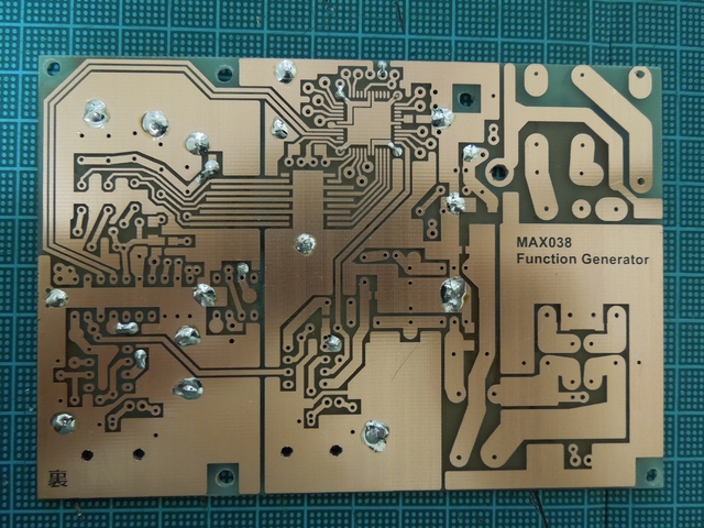 スルーホール代わりの表裏をつなぐジャンパ、チップコンデンサ、ディップIC、BNCコネクタ、
