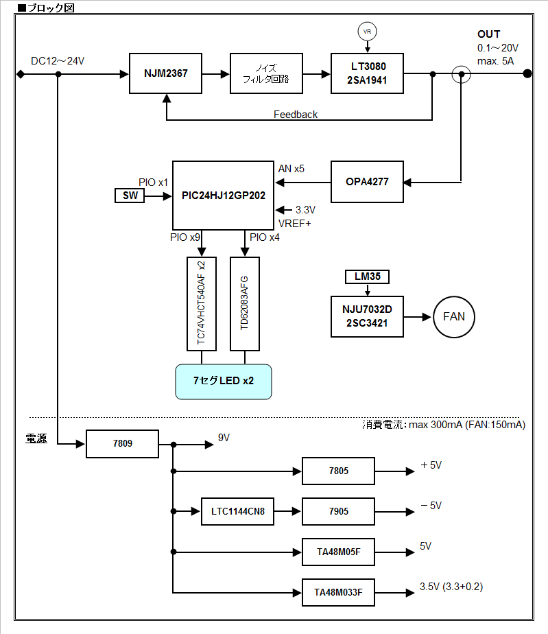 ・出力は単電源 0.1V~20V 可変方式  5A 以上
