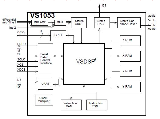 デジタル出力可能なものを探しまくりましたが、手頃なものがなく途方に暮れていた時に、何気に見ていた VS1053b の内部ブロック図に I2S の文字と外部へ向かう矢印が・・・。