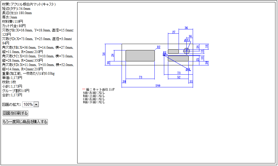 木材及びアクリルについては、ネットの加工販売を利用しました。下記はそのオーダーです。
