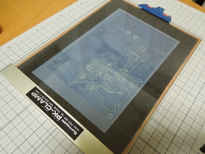 クランプとは違い、サンハヤトの感光専用マシーン「ちびらいと」はさすがに高いので隊長の稟議が通らず、いつものやり方で感光しました。