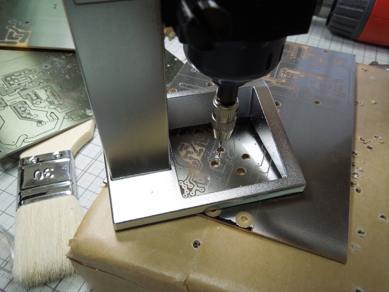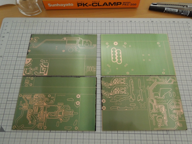 また、少なくともこの時点までに、基板のフチを必ずチェックして、パターンがショートしていないか確認します。フチはエッチングされていない場合が多く、ショートしている場合が多々あります。一見して判らない場合もありますから、カッター等でケガいておく位はやっておいた方が良いです。