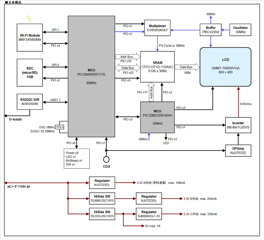 30MHzのオシレータからの出力を、クロックバッファを介して、PICとSRAMとLCDに分配供給