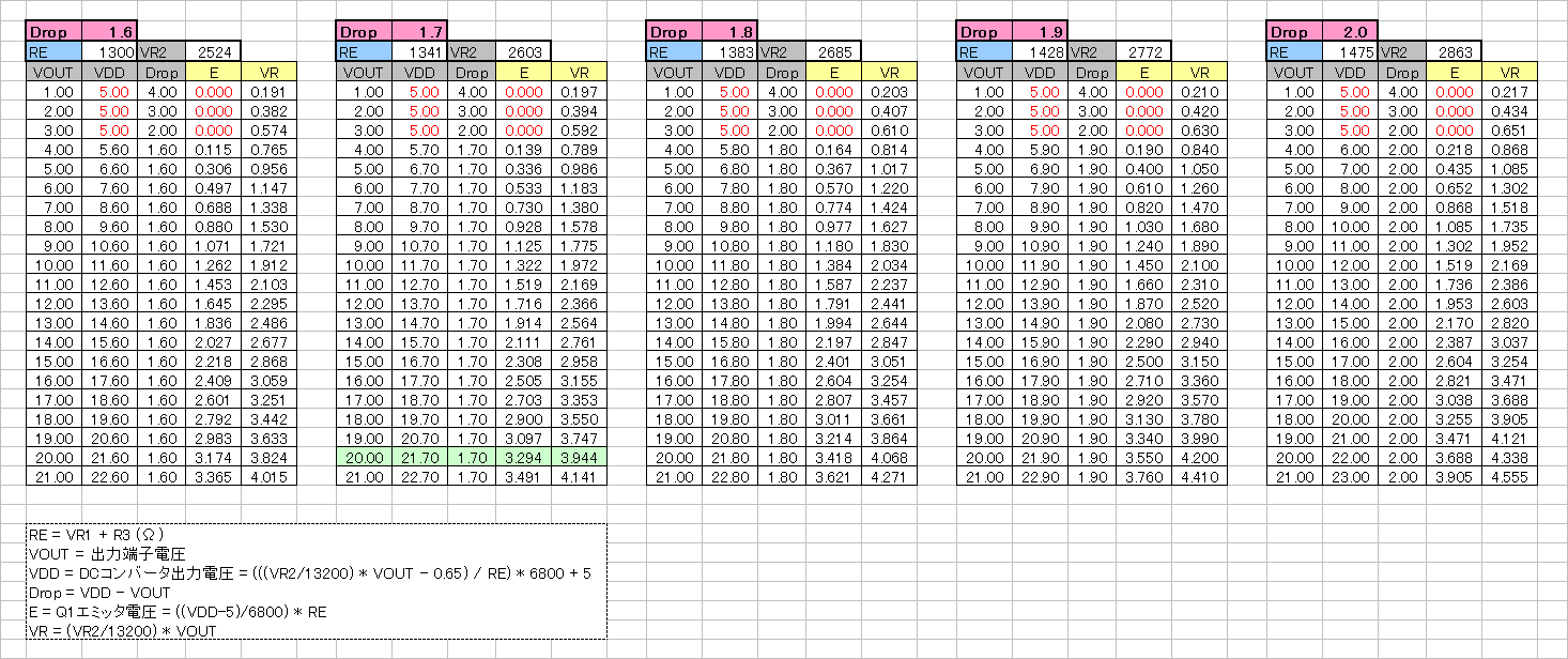 ここで調整表を参照して、20V出力時のQ1のエミッタ電圧を調べます。この電圧になるように
