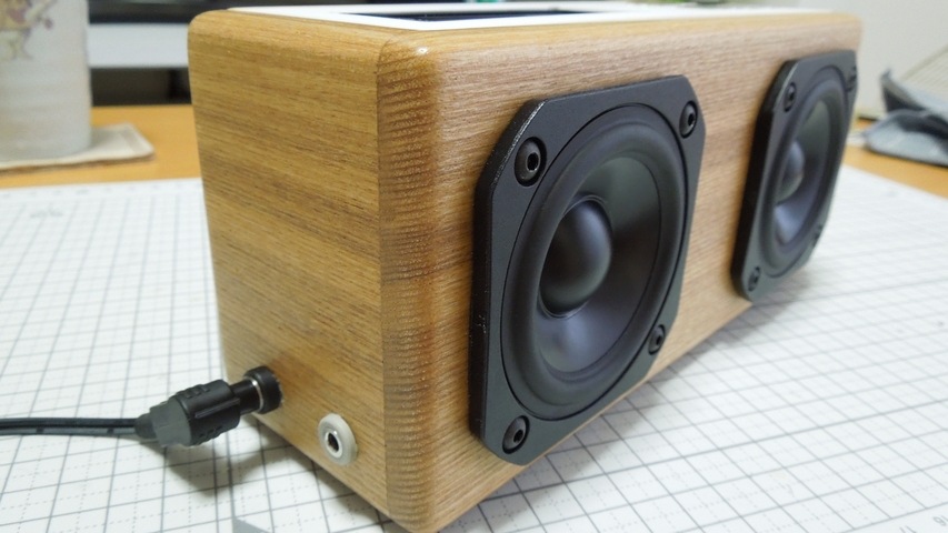 前作では、プラスチック(ABS樹脂)ケースの箱鳴りが少し気になったので、今回は木製ケースにしてみました。詳細は後ほど紹介しますが、ネットで加工販売している 府中家具.comさん 等から木材を購入して、木工に精を出しました。こんな事までやったのは、中学生の時にバスレフ型スピーカーを自作した時以来です。